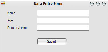หาก กำหนดว่า ในช่อง TextBox Name จะต้องมีข้อมูล อย่างน้อย 1 ตัวอักษร ไม่สามารถปล่อยว่างได้ ในช่อง Age จะต้องกรอกข้อมูล เป็นตัวเลข มากกว่า 35 และสุดท้าย Date of joining จะต้องไม่เกินวันที่ปัจจุบัน เราสามารถจะทำได้โดย ป้อน Code ลงใน Validating ของ TextBox ดังนี้
