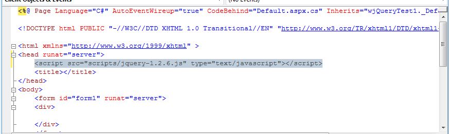 – - ให้ [ลาก /วาง] jquery-1.2.6.js จาก solution explorer มาวางไว้ที่ page เพื่อสร้าง reference ดังรูป