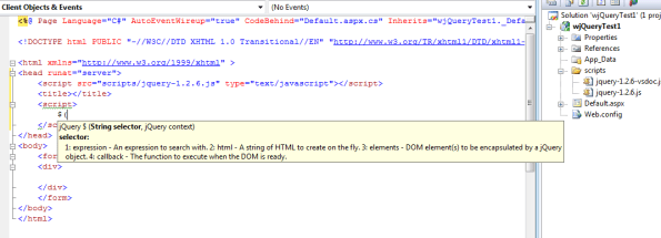 - เนื่องจาก เราได้ลง hotfix แล้ว เราก็ไม่ต้อง add reference ที่ jquery-1.2.6-vsdoc.js อีก เพราะ visual studio จะค้นหา vsdoc และ load เอง แค่เราวาง runtime library และ document file ไว้ที่เดียวกันเท่านั้น