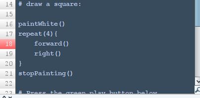 <pre># Draw a square paintWhite() repeat(4) { forward(2) right() } stopPainting()ส่วนข้อความที่อยู่หลัง เครื่องหมาย ‘#’ เราไม่ต้องสนใจก็ได้นะครับ เพราะมันไม่ถูก นำไปหประมวลผลแต่อย่างได้ นอกจากเป็นการเขียน comment ไว้เป้นคำอธิบาย ครับ